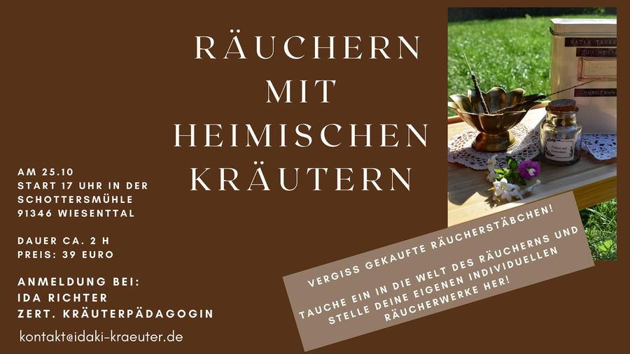 Du fragst dich: Wieso räuchern wir eigentlich? Oder: Was hat es mit diesen Rauhnächten auf sich, von denen alle sprechen? Dann bist du hier genau richtig! In einer entspannten Atmosphäre tauchst du ein in die Welt des Räucherns. Es erwartet dich eine ganz persönliche, eigene Räuchermischung, Räucherkohle & Sand, ein E-book als Zusammenfassung und du lernst heimische Räucherpflanzen und ihre Wirkung kennen. Komm vorbei und entdecke, wie du mit duftendem Rauch Raum schaffst - für Ruhe, Klarheit und neue Energie. Anmeldung unter kontakt@idaki-kraeuter.de Energieausgleich 39 Euro