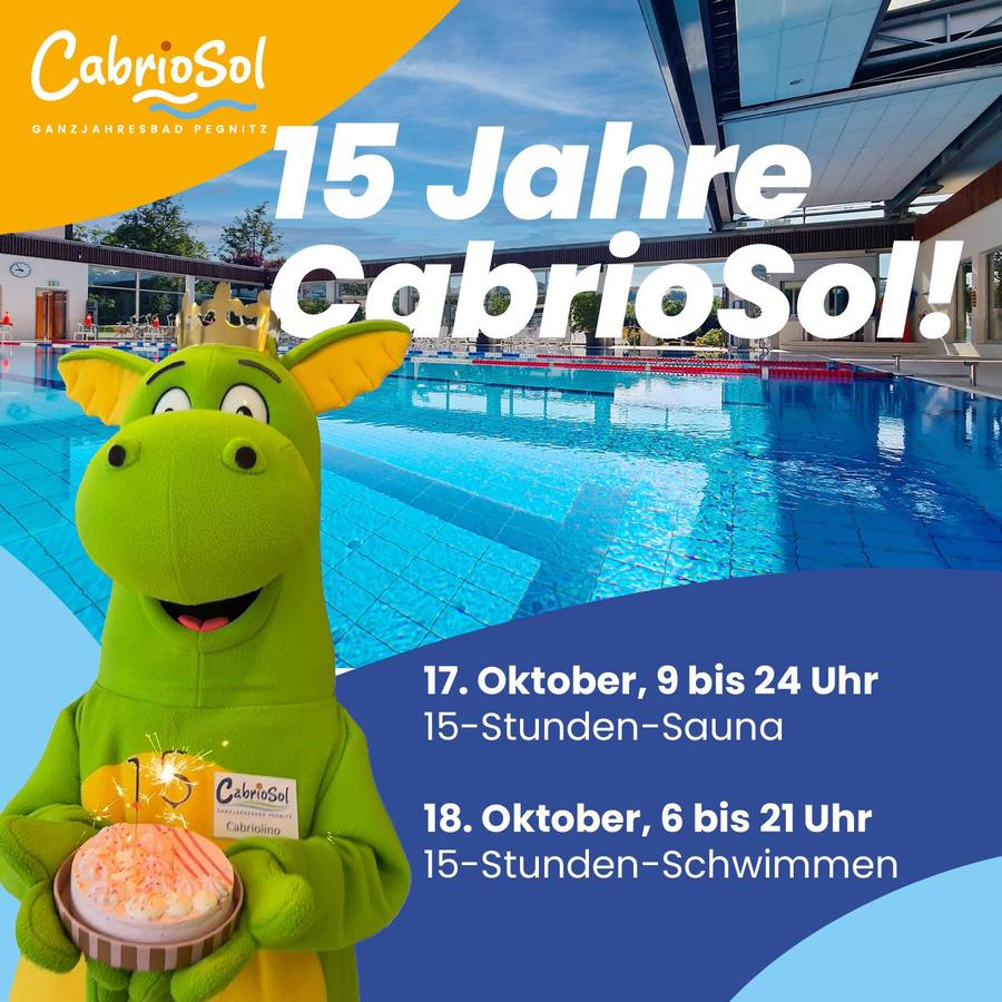 Karten: 18.10.: Jubiläum - Eintrittspreise wie vor 15 Jahren: Bad & Sauna für nur 7,00 € Tageskarte, erm. 5,00 €, www.cabriosol-pegnitz.de