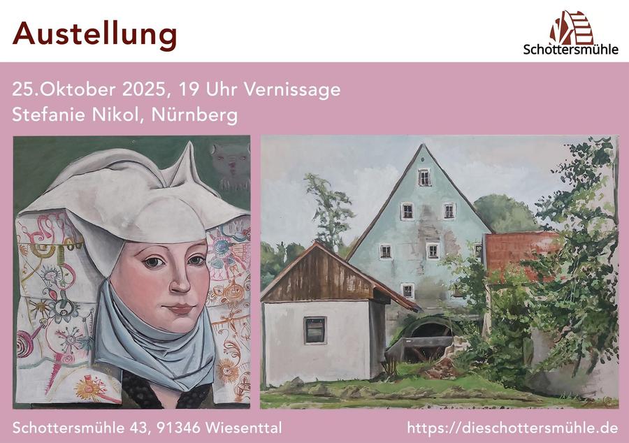 Die bildende Künstlerin und Kunstpädagogin Stefanie Nikol wird die gesamte Schottersmühle mit ihre Bilder verzaubern. Von Landschaftsmalerei, bevorzugt aus der Fränkischen, bis hin zu Portraits zeigt sie eine großen Vielfalt an Ausdrucksformen und Themen. Feiern Sie mit uns die Vernissage am 25 Oktober ab 19Uhr, bei der Sie die Künstlerin persönlich zu ihren Werken befragen können.