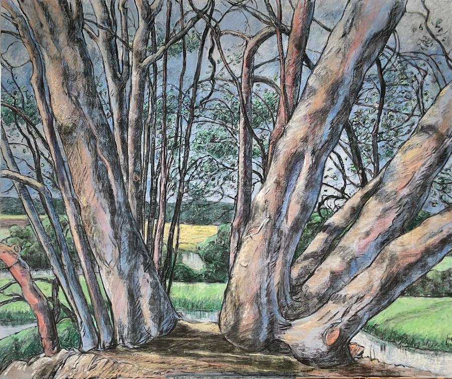 Wenn ein Wolf einem Wolf nachts im Wald begegnet, denkt er: Ah, ein Wolf. Wenn ein Mensch einem Menschen nachts im Wald begegnet, denkt er: Hah, ein Mörder! (André Heller) Obwohl der Wald längst zum beliebten Erholungsgebiet geworden ist, steckt doch immer noch ein bisschen Furcht in den meisten von uns, die ihren Ursprung in alten Erzählungen und Märchen hat. In diesen Geschichten ist der Wald bewohnt von erbarmungslosen Räuberbanden, Kinder fressenden Hexen, von sprechenden Wölfen, die Großmütter vertilgen und anderen Unholden. Die sind inzwischen alle ausgezogen. Heute ist der Wald ein Gegenmodell zur technisierten Welt, auch wenn wir zur Sicherheit eine Outdoor-App auf dem Handy haben. Und Harald Winter ergänzt: Auf den Gedanken, mich mit dem Wald zu befassen, kam ich bei einem Spaziergang. Ein Auwäldchen in der Nähe von Kirchehrenbach mit seinem Gewirr von Bäumen, Ästen und Zweigen, die sich auch noch im Wasser spiegelten, faszinierte mich. Zeichnerisch eine echte Herausforderung. Seitdem lässt mich das Thema nicht mehr los und mein Atelier füllt sich mit großformatigen Kohle- und Pastellzeichnungen mit Kantenlängen bis zu 2,10 m. Darunter sind auch Waldarbeiten von der Punta Licosa, einem Naturschutzgebiet in Süditalien, in dem ich immer wieder unterwegs bin. Dort findet man Olivenhaine, Eukalyptusbäume und seltsam gewachsene Pinien. Und noch etwas mag ich dort sehr: Der Wald hat Meerblick.
