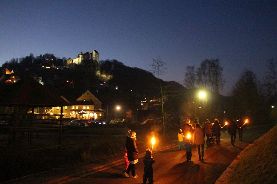 Herzlich Willkommen zu einem gemeinsamen Spaziergang durchs abendliche Egloffstein. Die Tour beginnt im Hof der Pension Mühle im Luftkurort Egloffstein. Auf einer gemütlichen Strecke geht es dann, ausgestattet mit Fackeln und Taschenlampen los. Die Tour ist ca. 1 bis 2 km lang und auch für Kinderwagen geeignet. Zum Abschluss gibt es noch Glühwein und Kinderpunsch sowie Plätzchen an der Feuerschale mit Blick zur beleuchteten Burg Egloffstein. Insgesamt dauert die Veranstaltung ca. 1,5 h. Gerne können auch eigene Fackeln und Lampions mitgebracht werden.