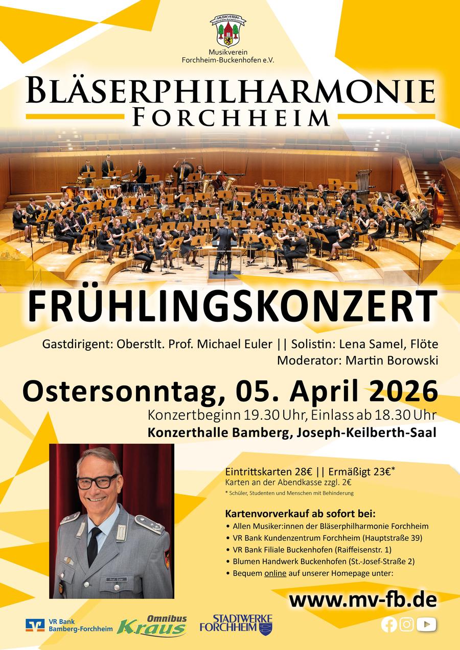 Unter der Leitung des Gastdirigenten Oberstlt. Prof. Michael Euler erwartet Sie ein unvergesslicher Abend, wenn der Musikverein Forchheim-Buckenhofen all seine Freunde, Fans, Fördermitglieder und geschätzten Sponsoren bereits zum 12. Mal in den Joseph-Keilberth-Saal herzlich einlädt.