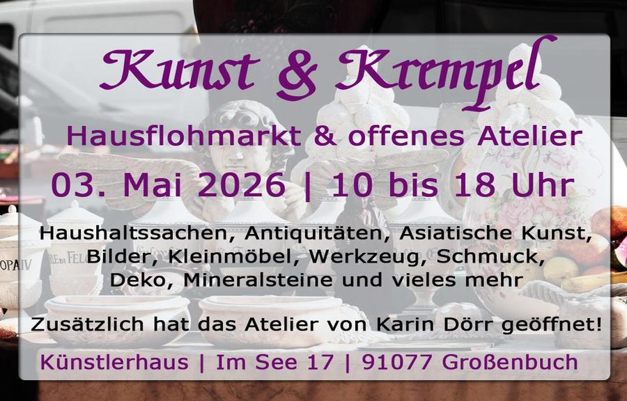 Stöbern sie entspannt zwischen Haushaltssachen, Antiquitäten, Gartendeko, Asiatische Kunst, Kleinmöbel, Bilder, Mineralsteinen, Textilien, Deko, Spielzeug, Werkzeug und vielen mehr in unserm Künstlerhaus beim Hausflohmarkt.