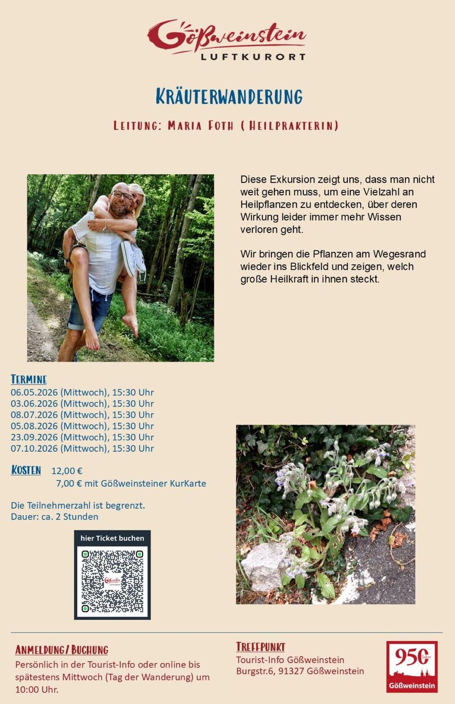 Kontakt: 12,00 € ohne KurKarte, 7,00 € mit KurKarte, www.ferienzentrum-goessweinstein.de