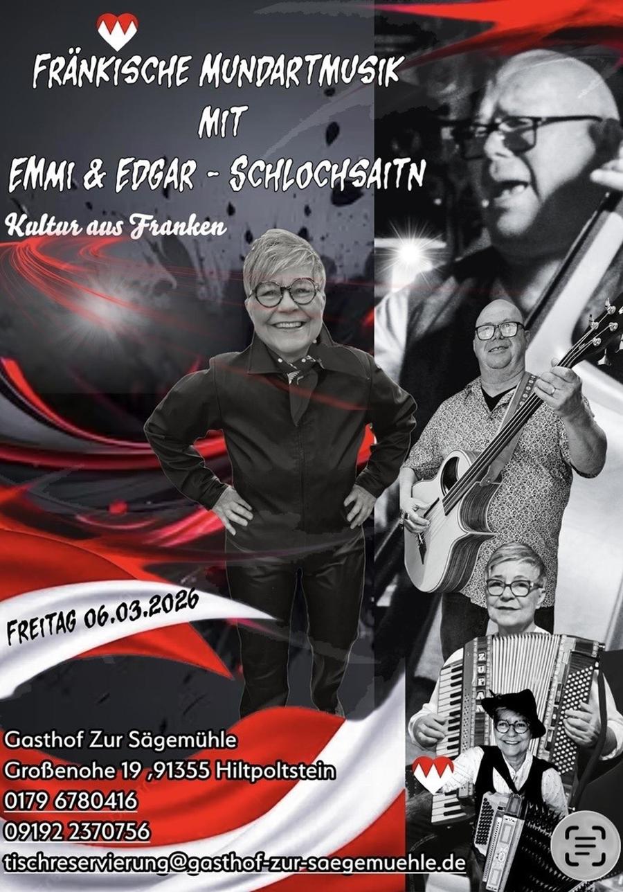 Emmi & Edgar spielen für euch von 19 bis 22 Uhr – am Freitag, 06. März 2026 im Gasthof zur Sägemühle, wo Wald, Weg, Musik und Wirtshaus zusammenkommen. Kommt vorbei, lasst euch nieder, und spürt, wie Franken klingt.