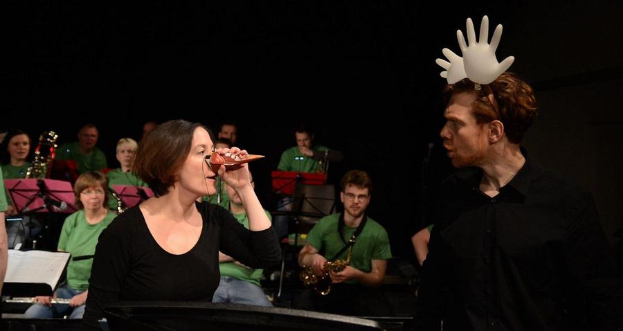 Das 20-köpfige BlueTrainOrchestra, die BigBand der städtischen Musikschule Bamberg unter Leitung von Sebastian Strempel, steht gemeinsam mit den beiden u.a. vom Kindertheater Chapeau Claque und dem Theater im Gärtnerviertel bekannten Schauspielern Heidi Lehnert und Benjamin Bochmann auf der Bühne. In Forchheim ist Benjamin Bochmann noch in seiner Rolle als „Der fränkische Jedermann“ bestens in Erinnerung.