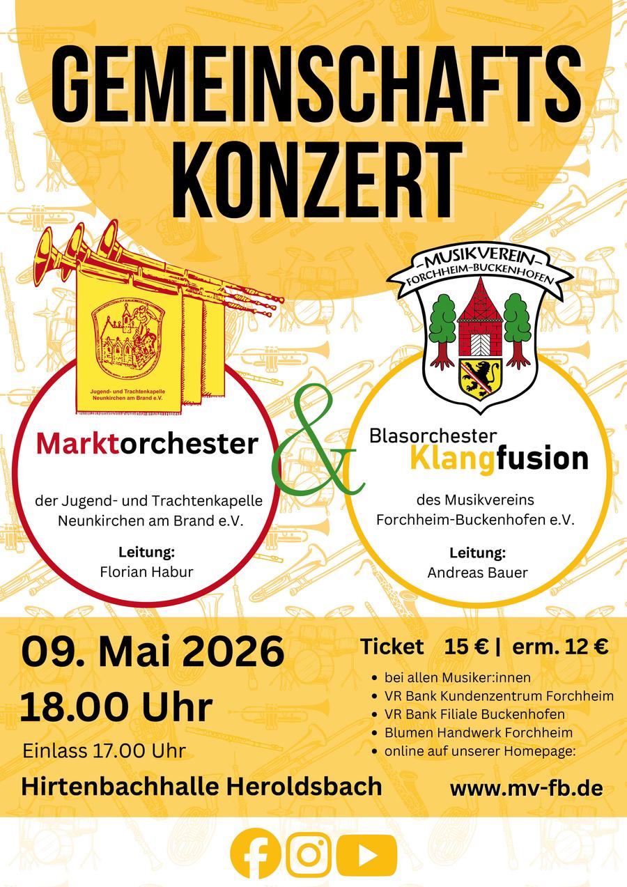 Nach einem gelungenen ersten gemeinsamen Konzert setzen das Marktorchester der Jugend- und Trachtenkapelle Neukirchen am Brand unter der Leitung von Florian Habur und das Blasorchester Klangfusion des Musikverein Forchheim-Buckenhofen unter dem Dirigat von Andreas Bauer ihre musikalische Zusammenarbeit fort.