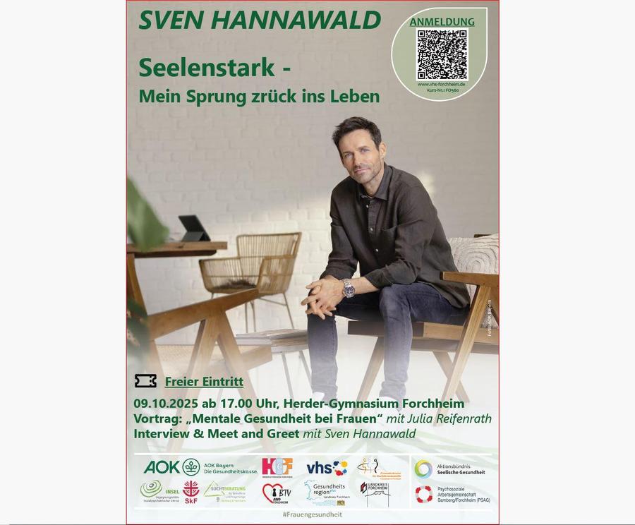 Im Rahmen zur bundesweiten Woche der seelischen Gesundheit lädt die AOK-Direktion Bamberg in Kooperation mit der Gesundheitsregionplus Landkreis Forchheim und dem Gesundheitsamt Forchheim zur Vortragsreihe seelenstark mit LUMEUS zu einer besonderen Abendveranstaltung ein. Unter dem Motto „Lass Zuversicht wachsen – Psychisch stark in die Zukunft“, steht diese Veranstaltung unter der Schirmherrschaft von Landrat Dr. Hermann Ulm und widmet sich den Themen mentale Gesundheit, Mental Load und Resilienz – insbesondere für Frauen. Ein spezieller Vortrag zum Thema „Mentale Gesundheit für Frauen“ von Julia Reifenrath mit dem Ziel Frauen zu stärken, bietet praktische Impulse zur Förderung der mentalen und emotionalen Gesundheit. Des Weiteren wird ein exklusiver Dokumentarfilm über den ehemaligen Hochleistungssportler Sven Hannawald gezeigt, welcher anschließend in einem Interview über seine Erfahrungen mit mentaler Resilienz spricht. Seine Einblicke sollen Mut machen und zeigen, wie wichtig es ist, psychisch fit zu bleiben – sowohl im Sport als auch im Alltag. An diesem Abend haben die Teilnehmenden die einmalige Gelegenheit, persönlich mit Sven Hannawald in Kontakt zu treten. Die Teilnahme ist kostenfrei! Eine Anmeldung bis zum 4. Oktober 2025 ist erforderlich.