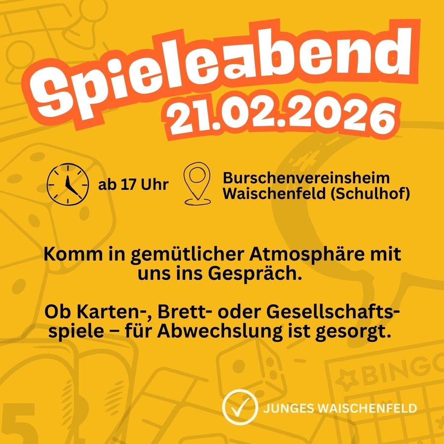 Am 21.02.2026 ab 17 Uhr laden wir herzlich zu einem Spieleabend im Burschenvereinsheim Waischenfeld (Schulhof) ein. In gemütlicher Atmosphäre wollen wir gemeinsam spielen, lachen und einen entspannten Abend verbringen. Ob Karten-, Brett- oder Gesellschaftsspiele – für Abwechslung ist gesorgt. Getränke und Snacks stehen bereit.