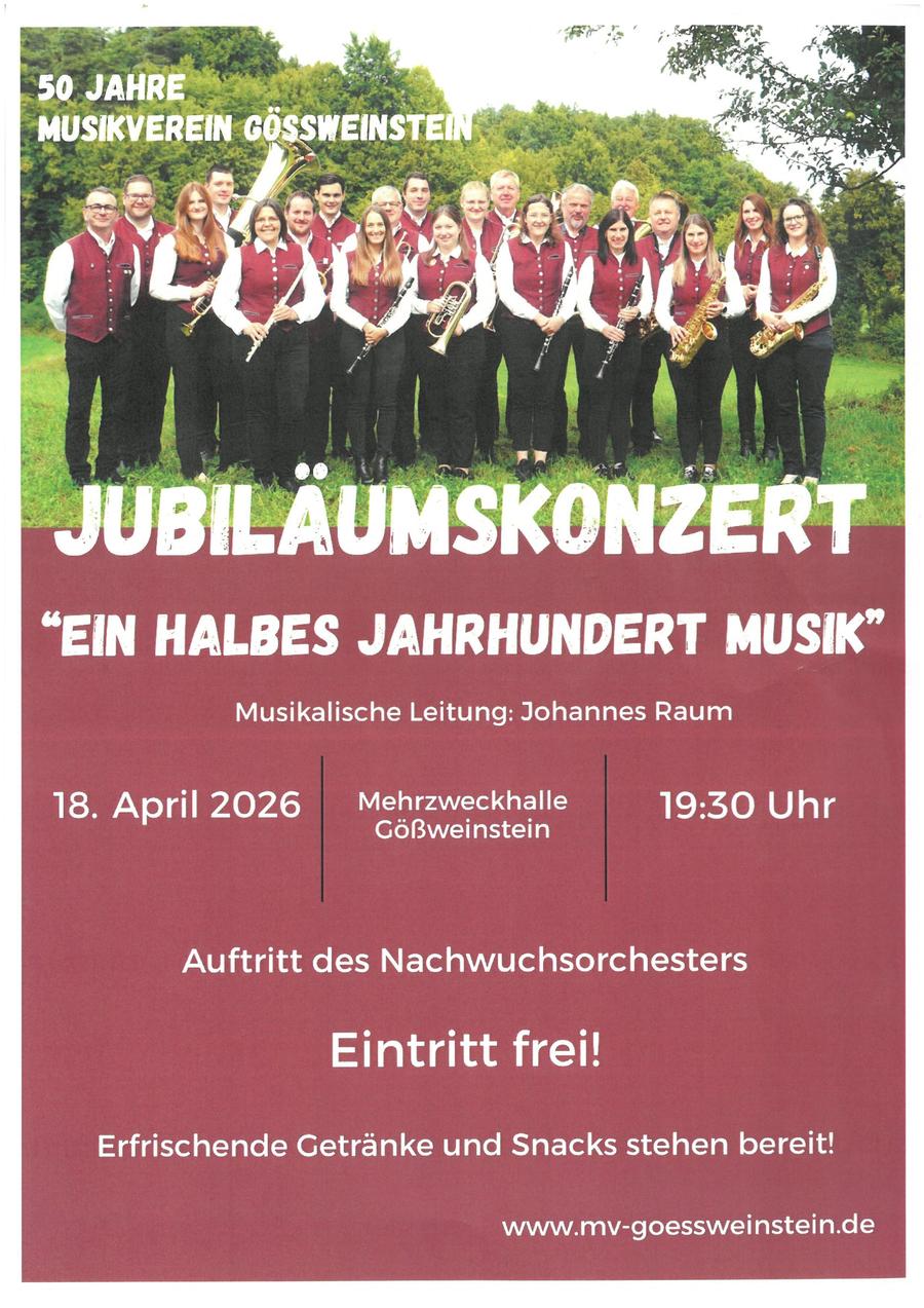 Der Musikverein Gößweinstein feiert im Jahr 2026 50-jähriges Jubiläum. Zu diesem Anlass gibt es extra ein Jubiläumskonzert.