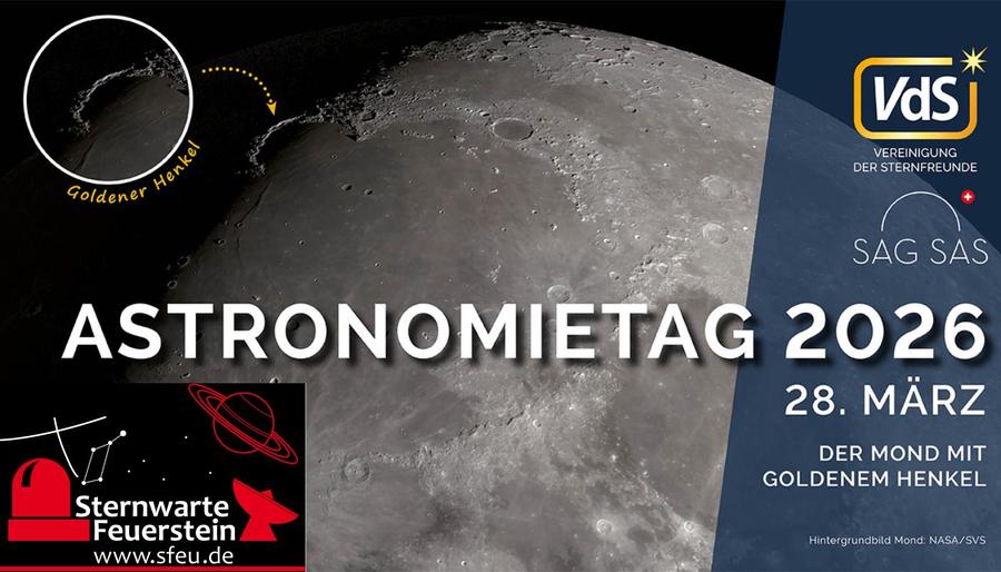Der Astronomietag 2026 findet am Samstag, den 28. März 2026 ab 17:00Uhr, im Form eines Abends der offenen Tür statt. An diesem bundesweiten Aktionstag, der von der Vereinigung der Sternfreunde e.V. (VdS) koordiniert wird, bieten Sternwarten, Planetarien und Vereine im gesamten deutschsprachigen Raum zahlreiche Veranstaltungen an, um der Öffentlichkeit den Nachthimmel näherzubringen. So auch die Sternwarte Feuerstein, die seit 1999 ihren Sitz 500m südlich des Flugplatzes hat.