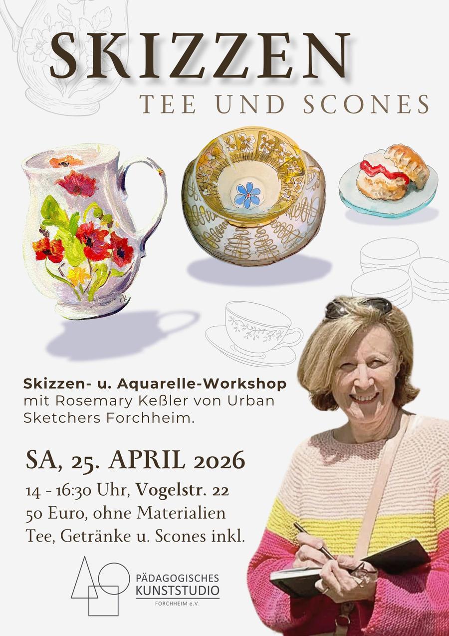 50,00 € inkl. Tee, Getränke u. Scones (ohne Materialien) Bitte mitbringen: Skizzenheft oder Skizzenblock nicht größer als A4, Bleistift, Fineliner, Aquarellfarben und/oder Buntstiften