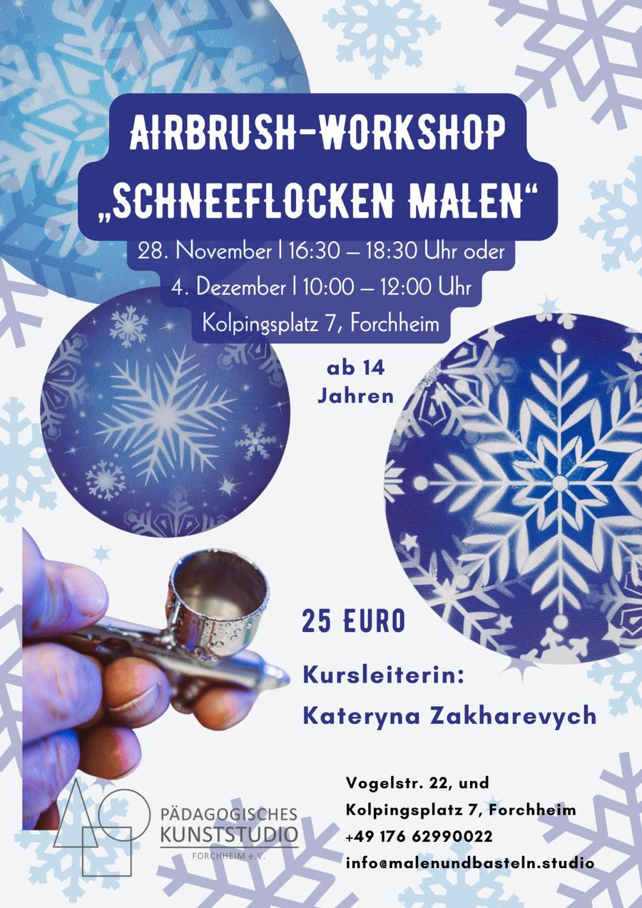 In diesem Workshop zauberst du mit Schablonen und Airbrush-Pistole funkelnde Schneeflocken auf deine eigene Leinwand. Perfekt zum Verschenken oder als Deko für die Weihnachtszeit.