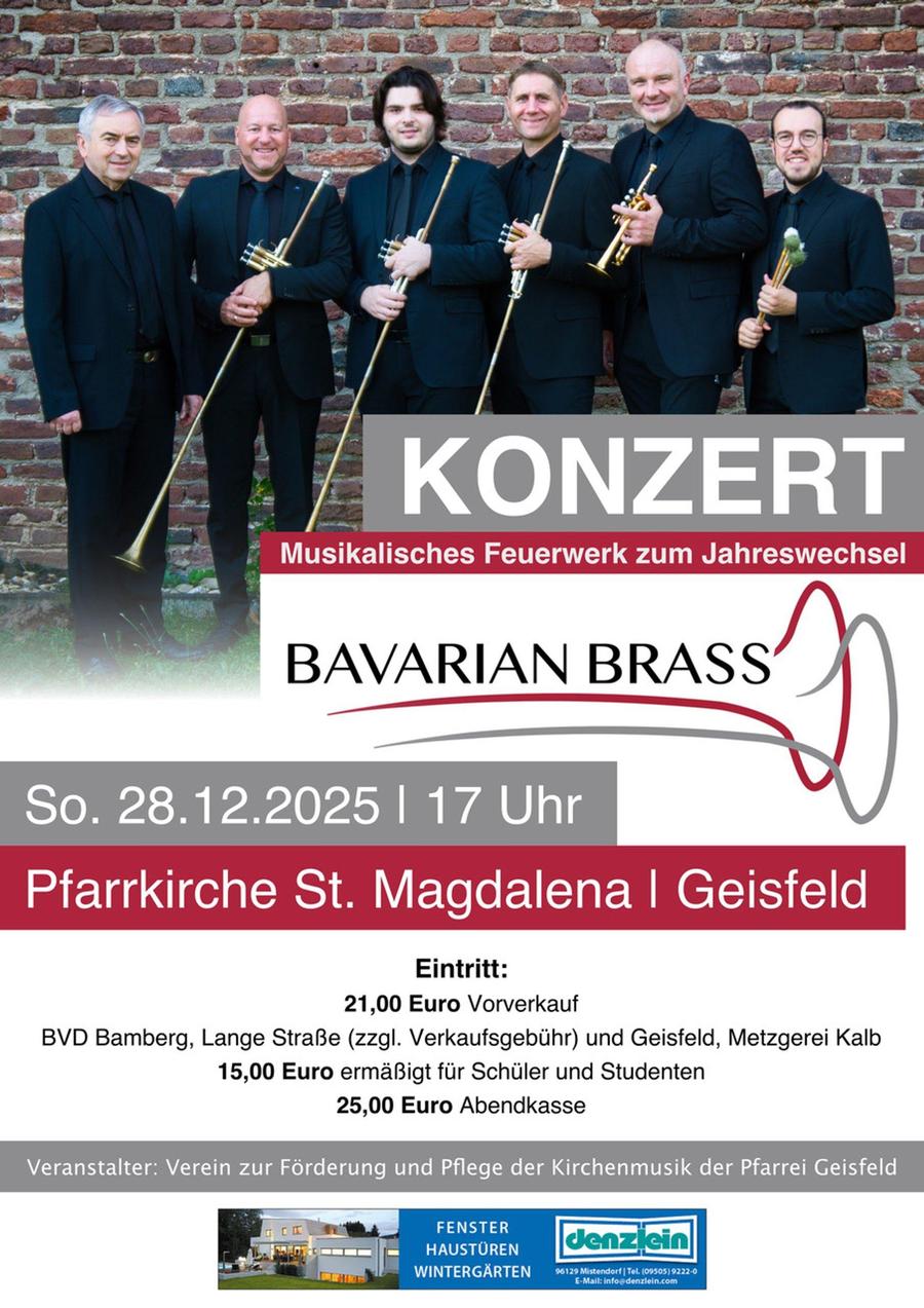 Ein festlicher musikalischer Jahresausklang erwartet die Besucherinnen und Besucher am Sonntag, den 28. Dezember 2025, um 17.00 Uhr in der Pfarrkirche St. Maria Magdalena in Geisfeld. Das renommierte Ensemble Bavarian Brass gestaltet unter der Leitung von Benjamin Sebaldein stimmungsvolles Jahresabschlusskonzert.