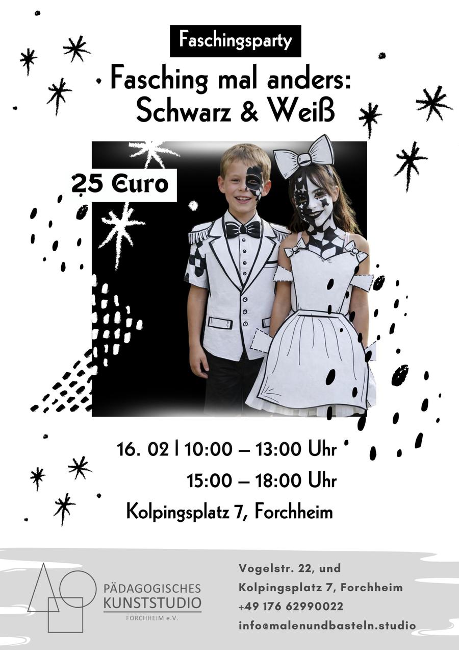 Wir basteln und schminken! Bitte kommen Sie in schwarzer und weißer Kleidung, passend zum Thema der Party.