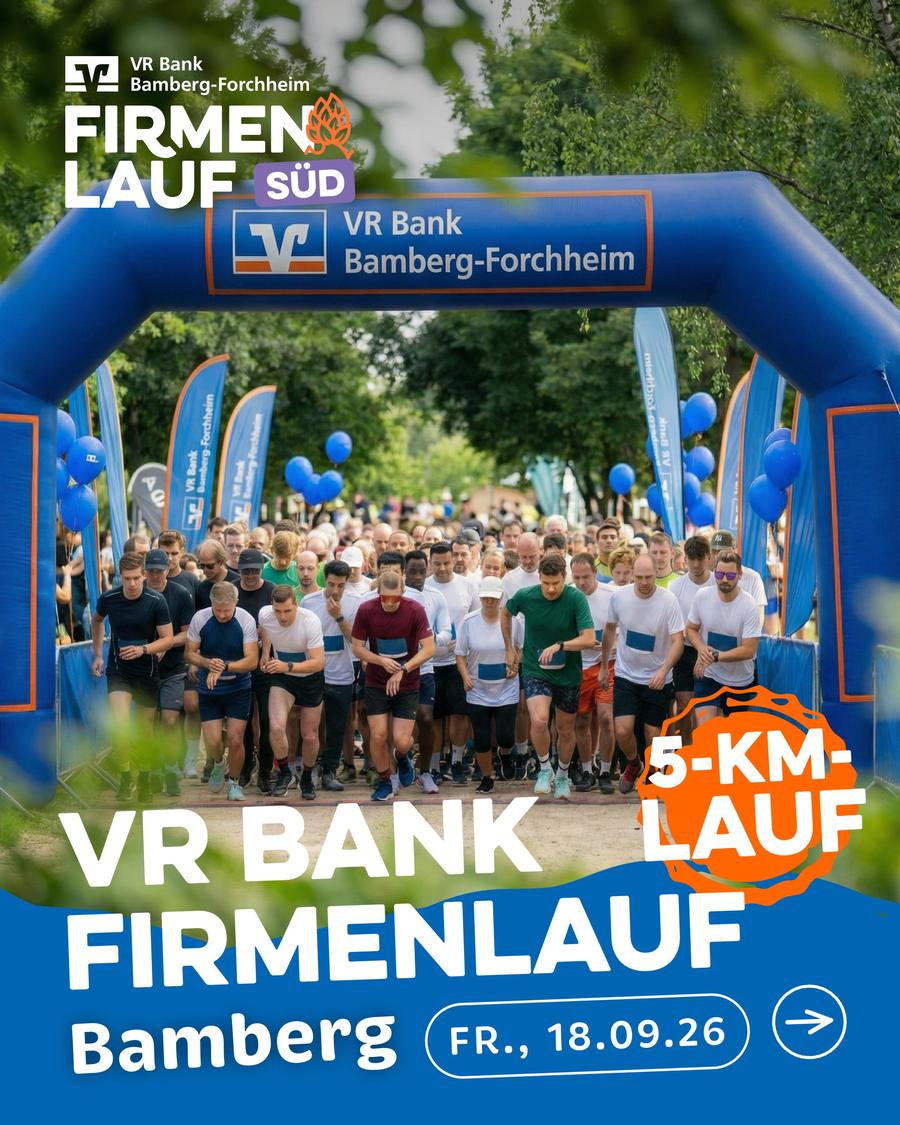 Von den Machern des Brauereienlaufs: Am Freitag, 18.09. geht es um Networking und Teamgeist beim ersten Firmenlauf VR Bank-Bamberg-Forchheim. Der Firmenlauf umfasst eine 5-km-Strecke ab Litzendorf, machbar in lockerem Tempo und mit genügend Zeit an den Verpflegungsstationen mit fränkischen Spezialitäten.