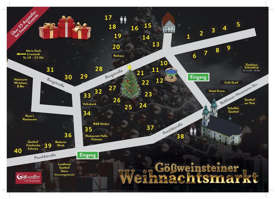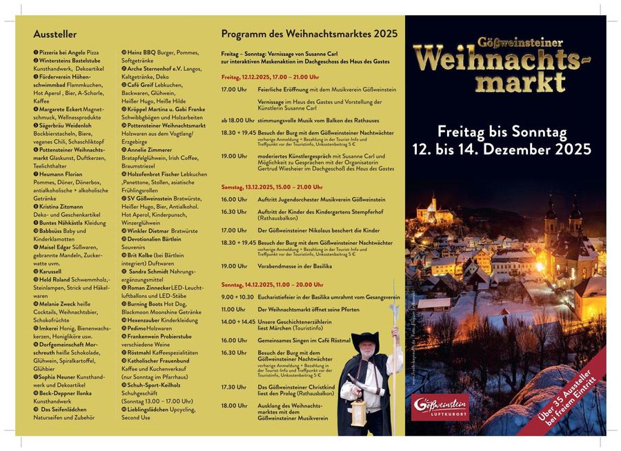 Der Markt Gößweinstein präsentiert seinen Weihnachtsmarkt auf der Burgstraße bei freiem Eintritt.