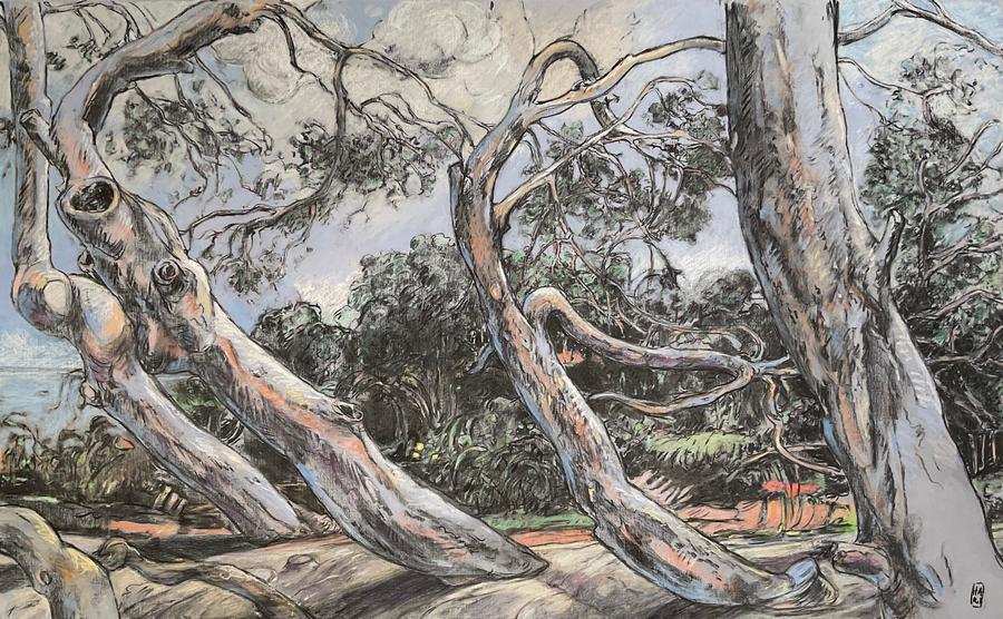 Wenn ein Wolf einem Wolf nachts im Wald begegnet, denkt er: Ah, ein Wolf. Wenn ein Mensch einem Menschen nachts im Wald begegnet, denkt er: Hah, ein Mörder! (André Heller) Obwohl der Wald längst zum beliebten Erholungsgebiet geworden ist, steckt doch immer noch ein bisschen Furcht in den meisten von uns, die ihren Ursprung in alten Erzählungen und Märchen hat. In diesen Geschichten ist der Wald bewohnt von erbarmungslosen Räuberbanden, Kinder fressenden Hexen, von sprechenden Wölfen, die Großmütter vertilgen und anderen Unholden. Die sind inzwischen alle ausgezogen. Heute ist der Wald ein Gegenmodell zur technisierten Welt, auch wenn wir zur Sicherheit eine Outdoor-App auf dem Handy haben. Und Harald Winter ergänzt: Auf den Gedanken, mich mit dem Wald zu befassen, kam ich bei einem Spaziergang. Ein Auwäldchen in der Nähe von Kirchehrenbach mit seinem Gewirr von Bäumen, Ästen und Zweigen, die sich auch noch im Wasser spiegelten, faszinierte mich. Zeichnerisch eine echte Herausforderung. Seitdem lässt mich das Thema nicht mehr los und mein Atelier füllt sich mit großformatigen Kohle- und Pastellzeichnungen mit Kantenlängen bis zu 2,10 m. Darunter sind auch Waldarbeiten von der Punta Licosa, einem Naturschutzgebiet in Süditalien, in dem ich immer wieder unterwegs bin. Dort findet man Olivenhaine, Eukalyptusbäume und seltsam gewachsene Pinien. Und noch etwas mag ich dort sehr: Der Wald hat Meerblick.