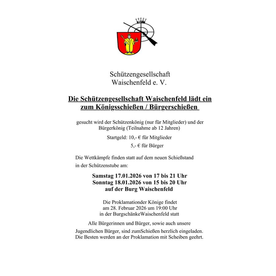 Die Proklamation der Könige findet am 28.02.26 um 19:00 Uhr in der Burgschänke Waischenfeld statt.