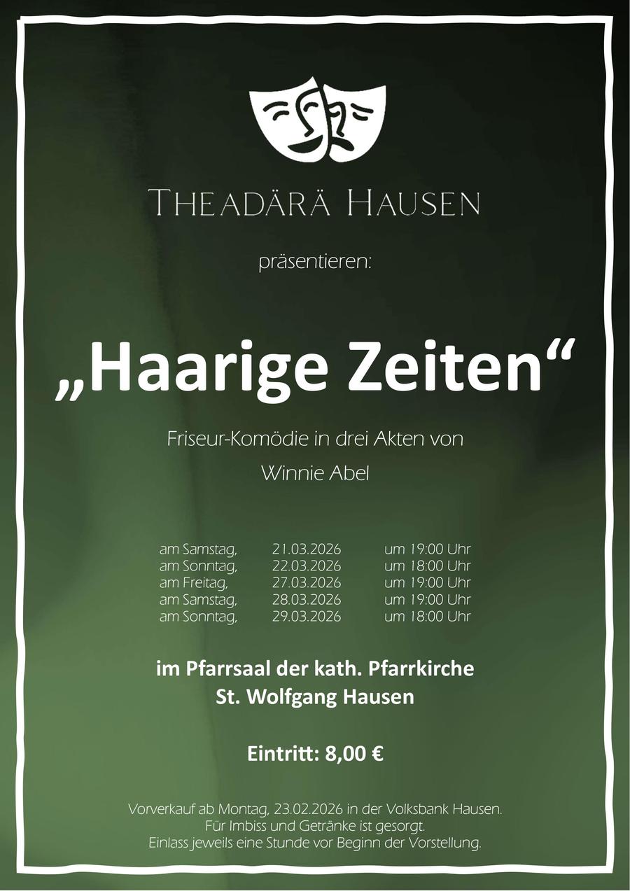 Die Theadärä Hausen sind im März 2026 wieder bereit, auf die Bühne zu gehen.Mit dem Stück Haarige Zeiten, eine Friseur-Komödie in drei Akten, garantiert die Gruppe für viele Lacher.