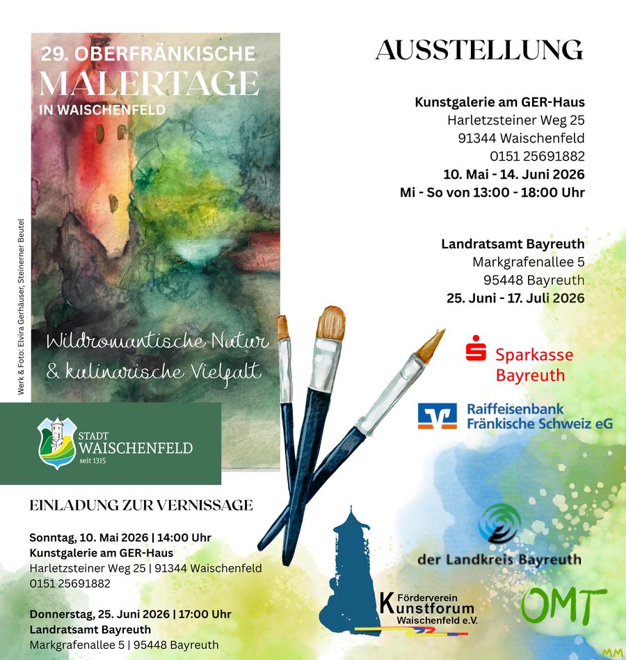 die Präsentation der Werke der 29. Oberfränkischen Malertage Waischenfeld wird mit der Vernissage am Sonntag, 10.5.2026, 14.00 Uhr in der Kunstgalerie am GER-Haus beginnen. Sie endet am 14.6.2025.