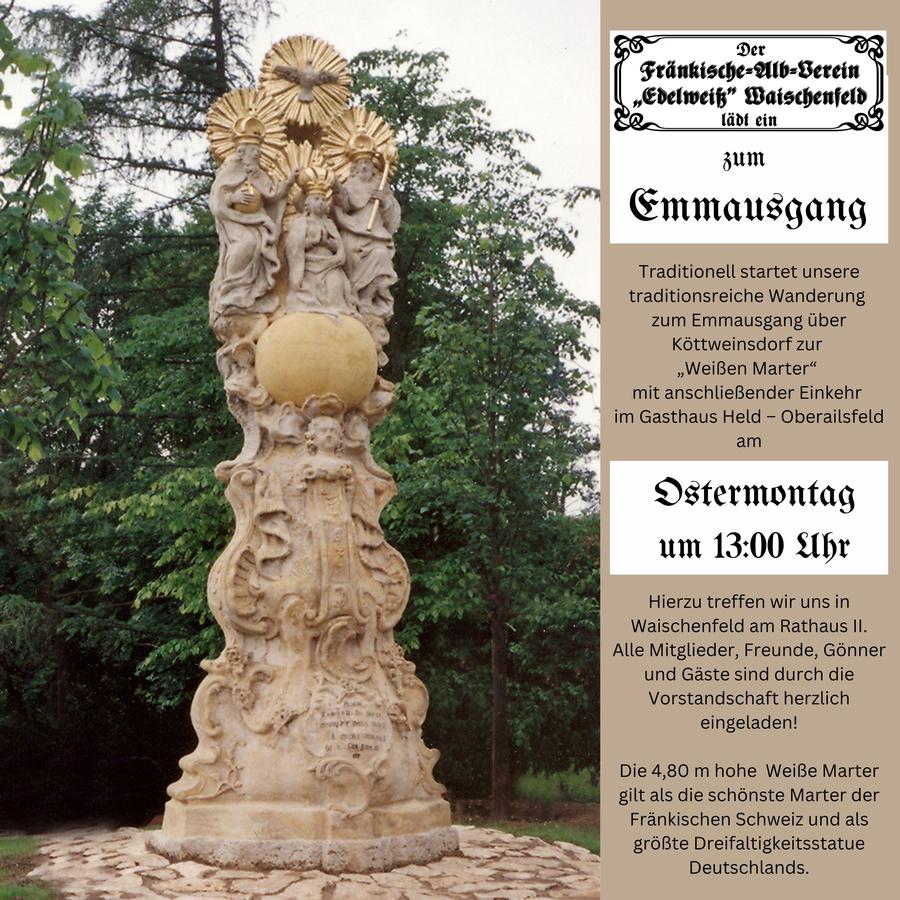 Traditionell startet unsere traditionsreiche Wanderung zum Emmausgang über Köttweinsdorf zur „Weißen Marter“ mit anschließender Einkehr im Gasthaus Held – Oberailsfeld am Ostermontag um 13:00 Uhr.