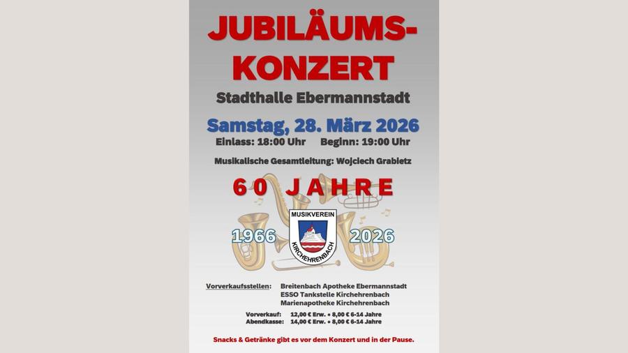 Anlässlich des 60-jährigen Bestehens spielen am 28. März 2026 alle Orchester des Musikvereins Kirchehrenbach.