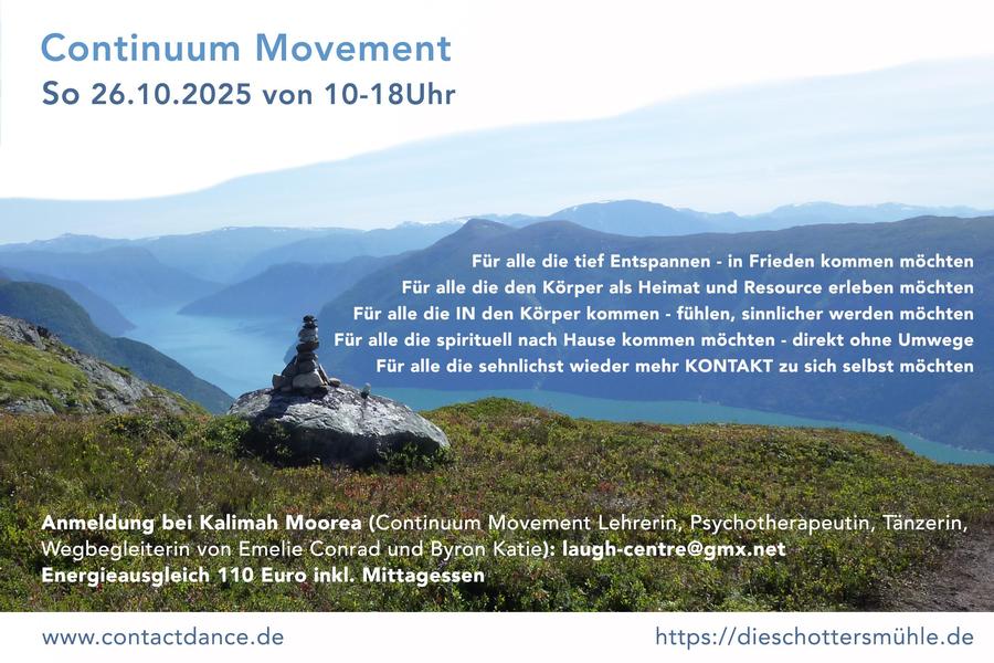 Für alle die tief Entspannen - in Frieden kommen möchten Für alle die den Körper als Heimat und Resource erleben möchten Für alle die IN den Körper kommen - fühlen, sinnlicher werden möchten Für alle die spirituell nach Hause kommen möchten - direkt ohne Umwege Für alle die sehnlichst wieder mehr KONTAKT zu sich selbst möchten. Mit Kalimah Moorea (Continuum Movement Lehrerin, Psychotherapeutin, Tänzerin, Wegbegleiterin von Emelie Conrad und Byron Katie)