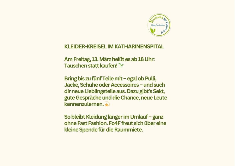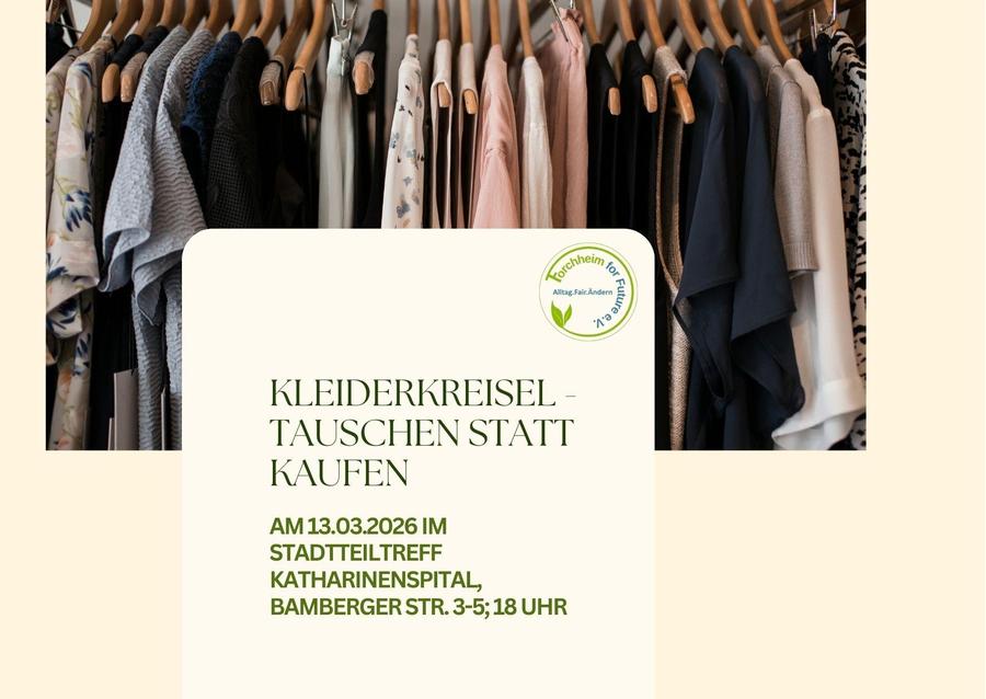 Am Freitag, den 31. März 2025 findet ab 18:00 wieder ein von Fo4F initiierter Kleider-Kreisel im Stadtteiltreff Katharinenspital, Bambergerstr. 3-5 statt. Wer zu viele Kleider im Schrank hat, die sie/er nicht mehr tragen möchte, die aber einfach zu schade zum Wegschmeißen sind, ist herzlich willkommen. Bis zu fünf Kleidungsstücke dürfen mitgebracht werden, auch Schals, Hüte oder Schuhe. So kann man seinen Look verändern ohne Geld auszugeben, sich bei einem Gläschen Sekt gegenseitig beraten und neue Leute kennenlernen. Kleidung wird länger wertgeschätzt - keine Fast-Fashion mit Fo4F!